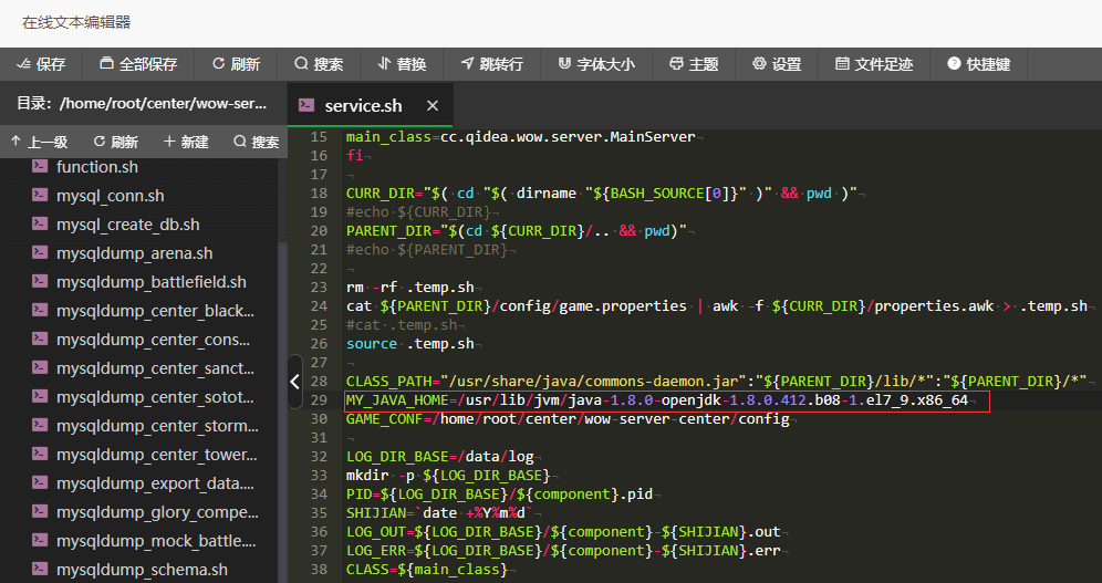 在 /home/root/center/wow-server-center/scripts/service.sh(29 行)和 /home/root/wow-server-dldl_1/scripts/service.sh(26 行)文件中,找到 MY_JAVA_HOME 设置为: