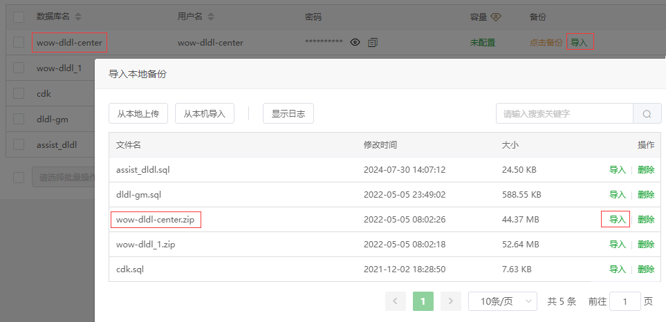 5 个数据库全部添加完后,依次导入数据库,点击导入,选择对应的数据库进行导入。wow-dldl_1 和 wow-dldl-center 比较大,导入时间会比较长,耐心等待下就好。