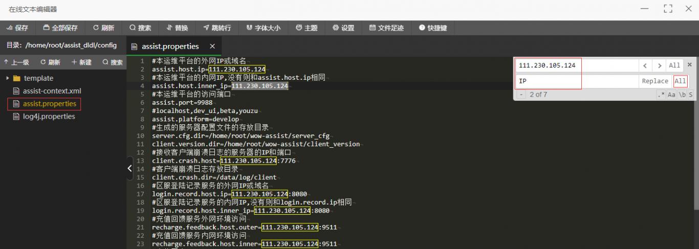 在宝塔中找到对应文件,Ctrl+F 批量替换 IP 即可。以第一个文件 assist.properties 为例: