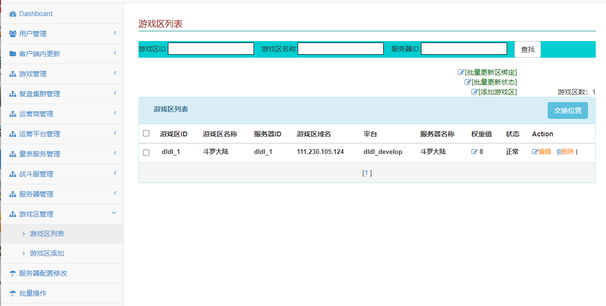 游戏后台有三个,第一个是运维后台链接:http://IP:9988,默认账号:admin,默认密码:123456,可以对游戏服务器和区,还有玩家进行一些管理。